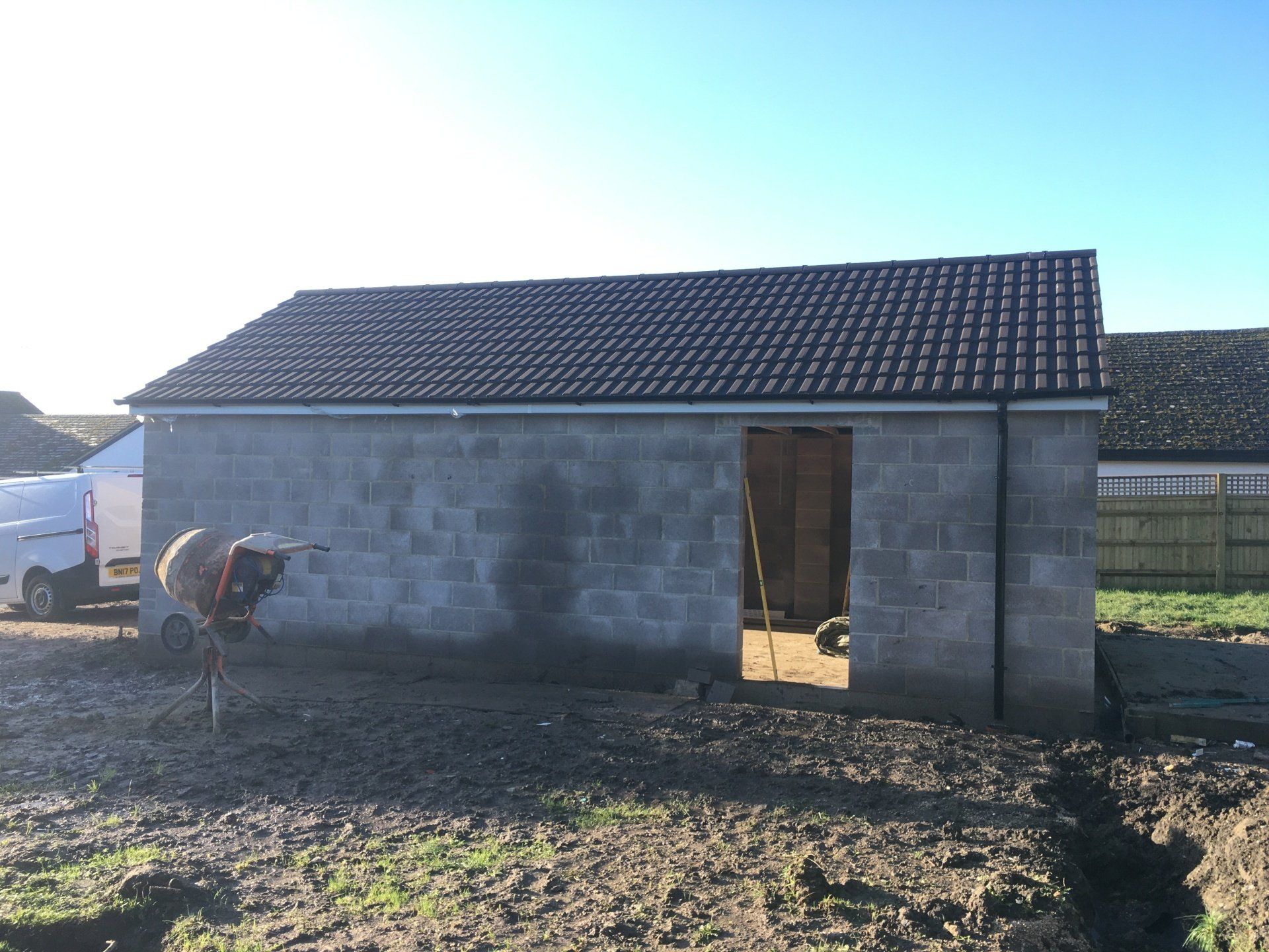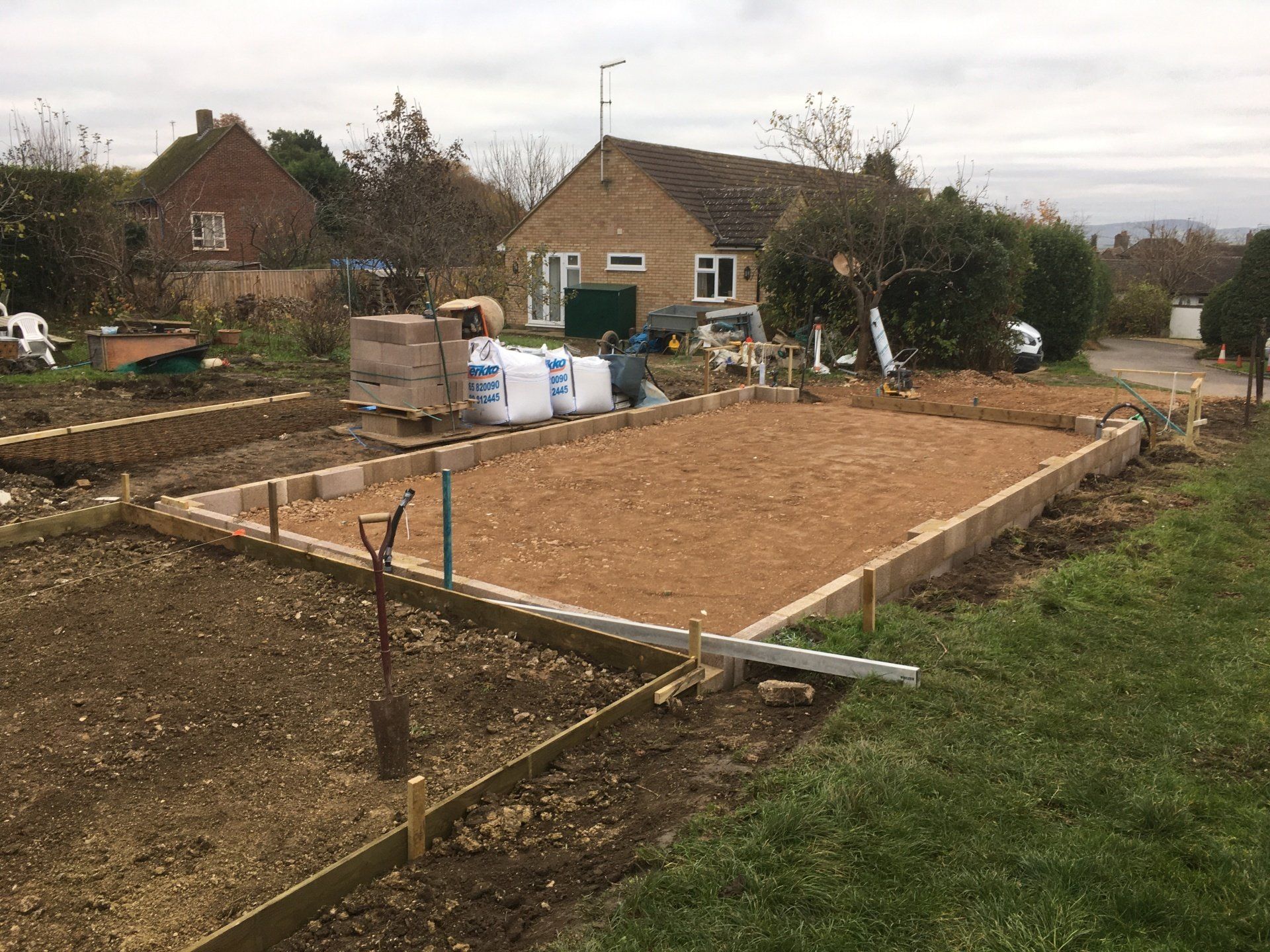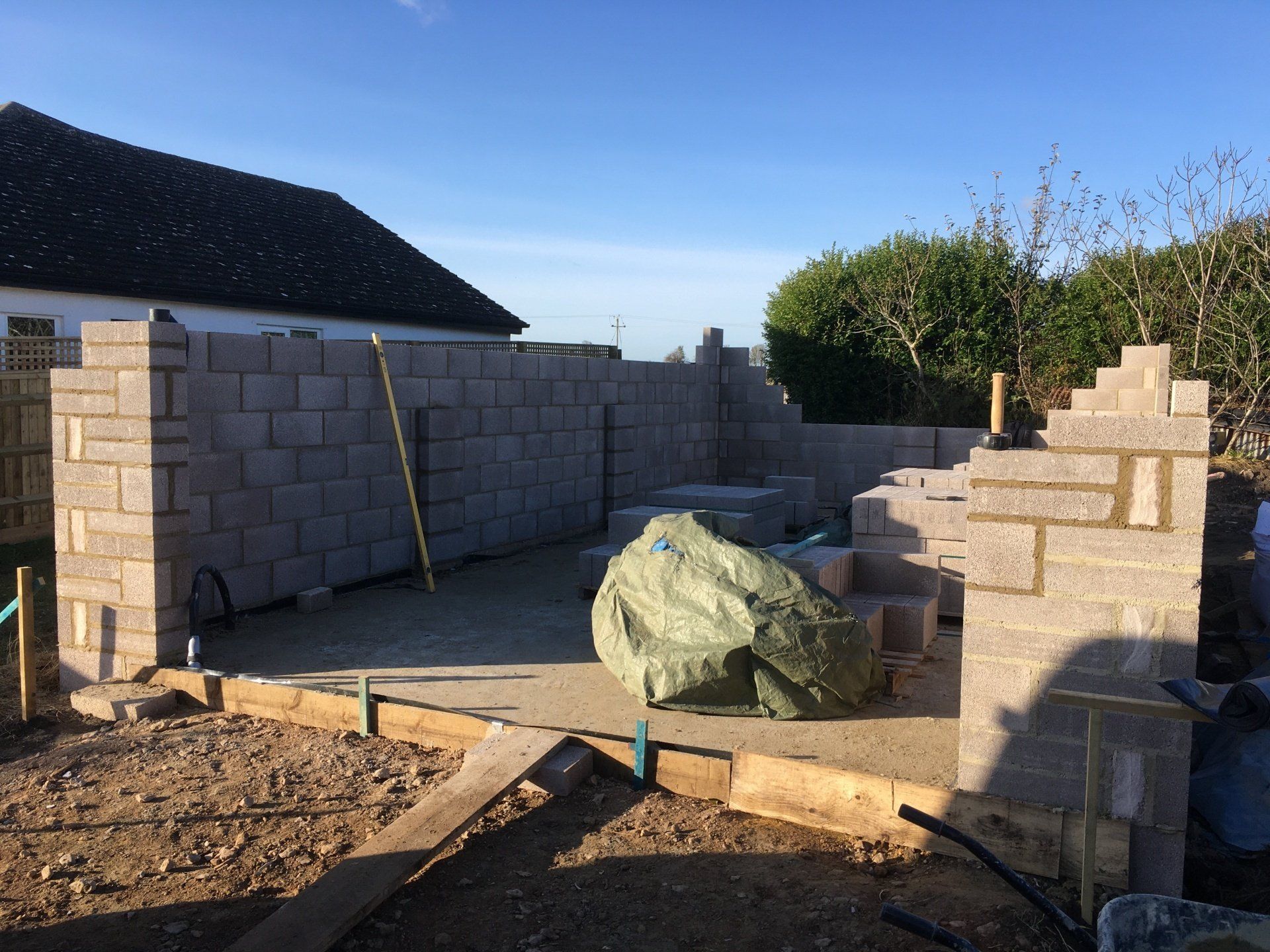 Here are some gallery photos taken during a recent garage build in Buckinghamshire. The project required the removal of an existing greenhouse and several fig trees*. The greenhouse had some substantial footings consisting of concrete and concrete hollow blocks. These were removed in the process of digging the new foundation. The new proposed footprint was 45 square metres (485 sq ft)- which given the size fitted nicely on the existing plot. A further concrete slab was provided at the rear of the garage along with water connections at the rear and inside via mdpe pipework and copper/brass fittings. Electricity was also provided via an SWA cable along with additional cables for security devices. The entire project was completed to the client's requirements along with some additional works to add a gravel driveway.